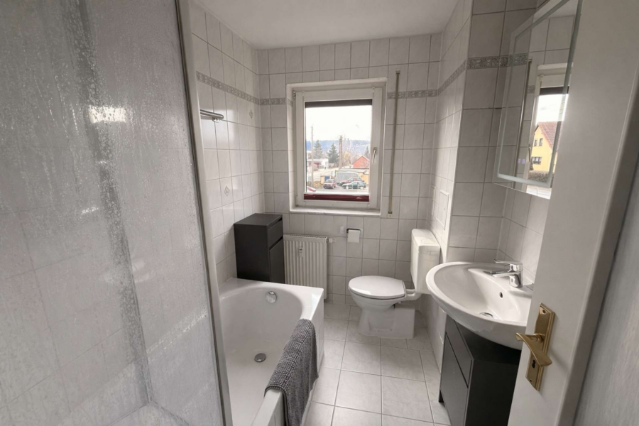 Der Bodenbelag aus Laminat in den Wohn- und Schlafbereichen sowie Fliesen im Sanitärbereich und in der Küche sorgt für ein harmonisches Gesamtbild. Das Badezimmer rundet das Angebot mit einer soliden Ausstattung ab.
